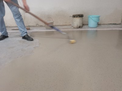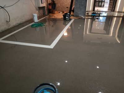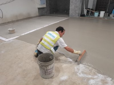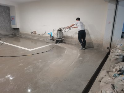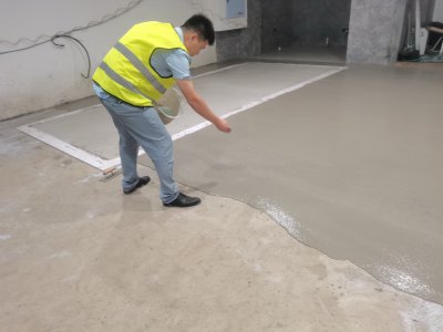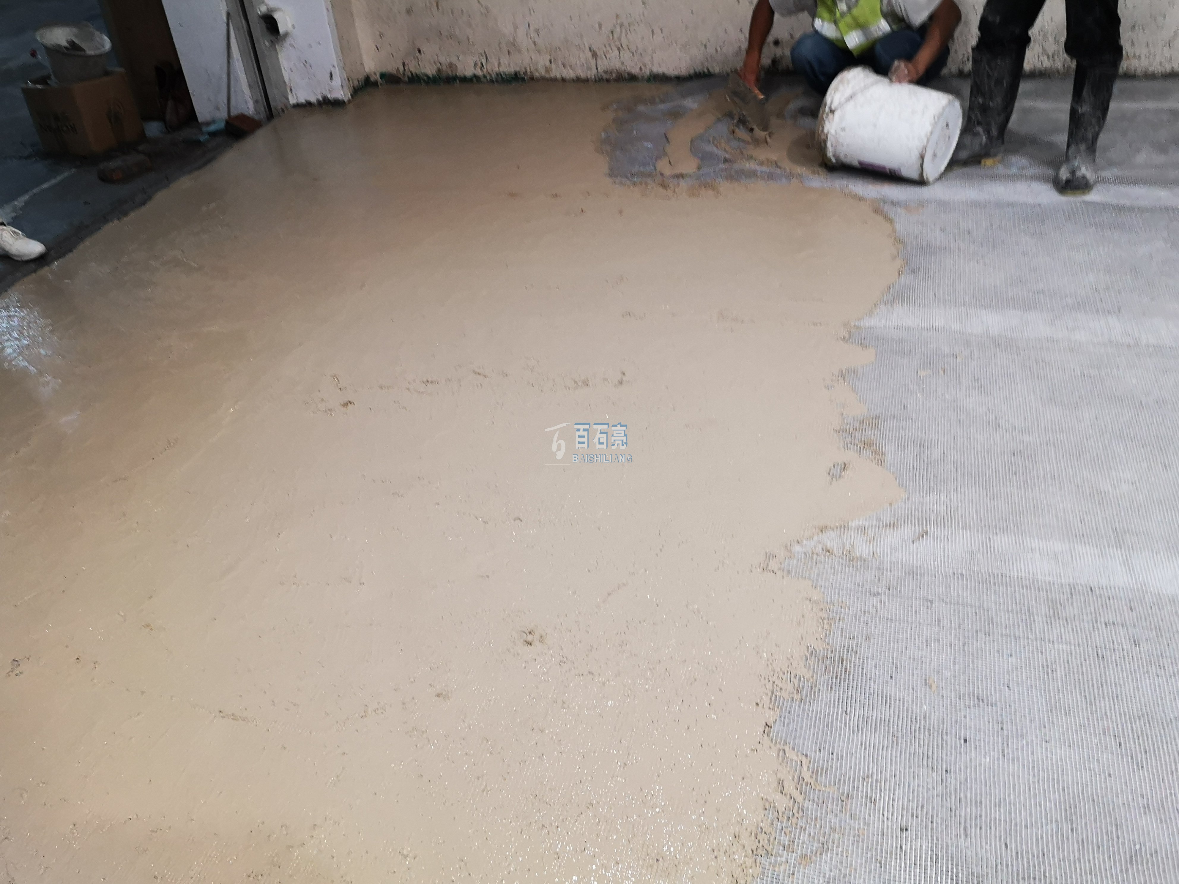 鋪設(shè)玻釬網(wǎng)、鋪設(shè)界面層,將界面砂漿與水?dāng)嚢杌旌暇鶆?,然后將材料倒在地面上,均勻批刮用量?2mm左右(混泥土平整度和強(qiáng)度.天氣溫度直接影響到界面材料用量浮動(dòng) 0.1 屬于正常范圍),滾筒涂刷時(shí),要求方向一致、輕重恰當(dāng),刷紋均勻,無(wú)遺漏。(如有遺漏及不飽滿將會(huì)產(chǎn)生抹光機(jī)絞砂和空鼓現(xiàn)象)。