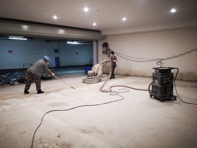 粗磨時(shí)應(yīng)配合 2m 靠尺對(duì)打磨的地坪進(jìn)行平整度檢測(cè),將偏高部位磨至平整度達(dá)標(biāo)為準(zhǔn),粗磨應(yīng)磨出所有骨材紋理,粗磨平整度控制在 2 米 1 毫米為準(zhǔn)。50-150目的金剛石磨片開(kāi)面打磨,使地面更平整、光滑(干磨)
