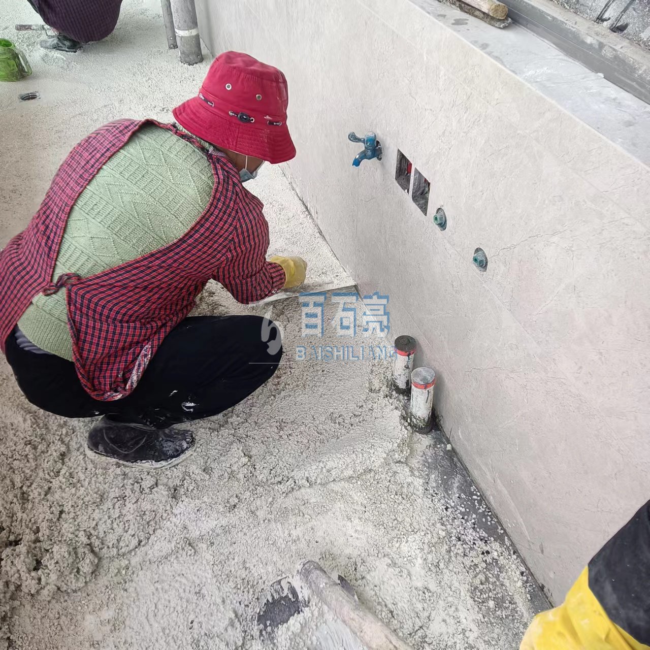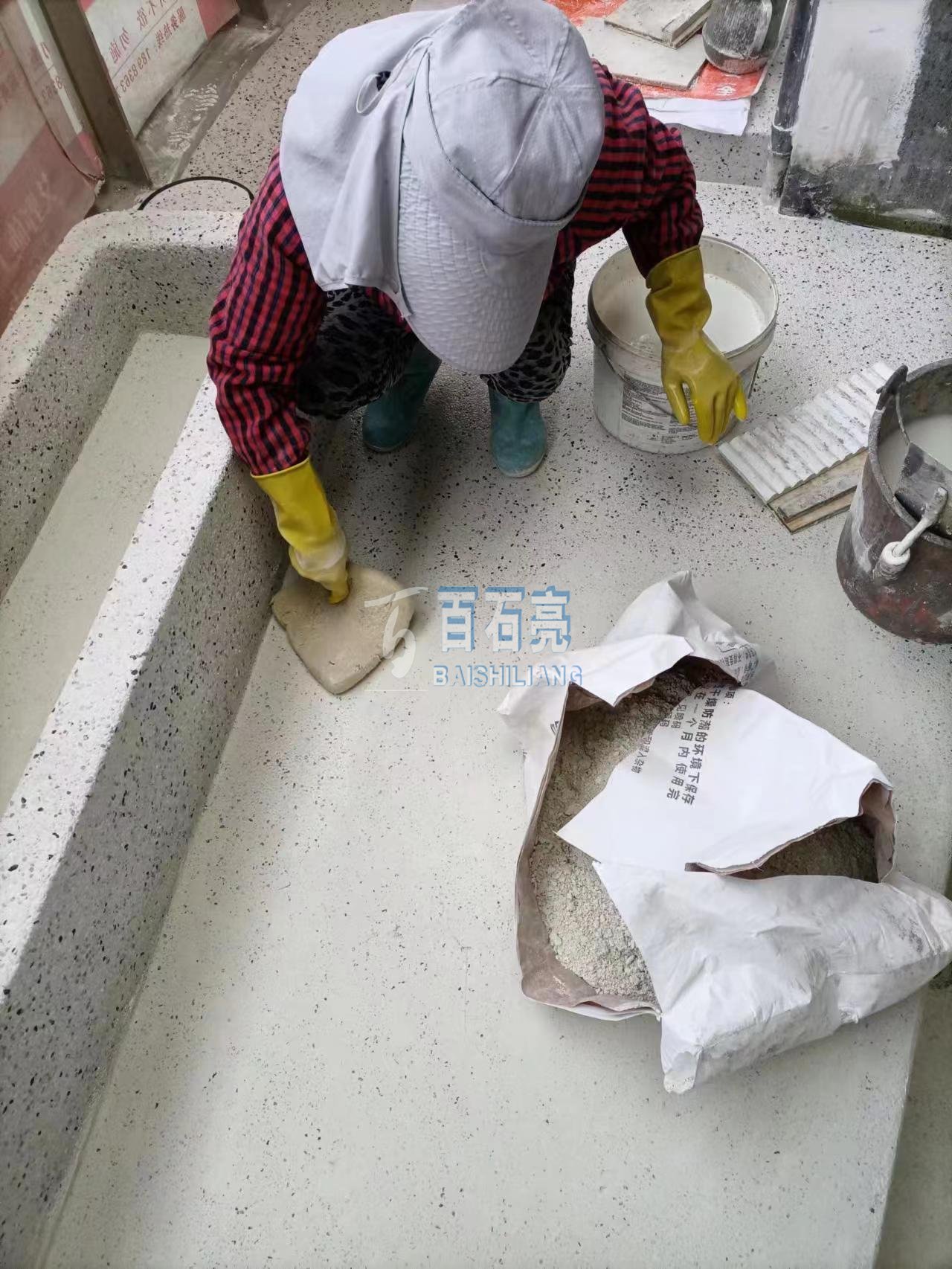 - 渝北壹江郡花園水磨石 這是一款由白色水泥加白色骨料 均勻混合而成的水磨石 用在花園地面 光滑又平整 清新自然 攤鋪 將混合均勻的水磨石材料攤鋪在地面上厚度1.5-2公分。 使用靠尺...