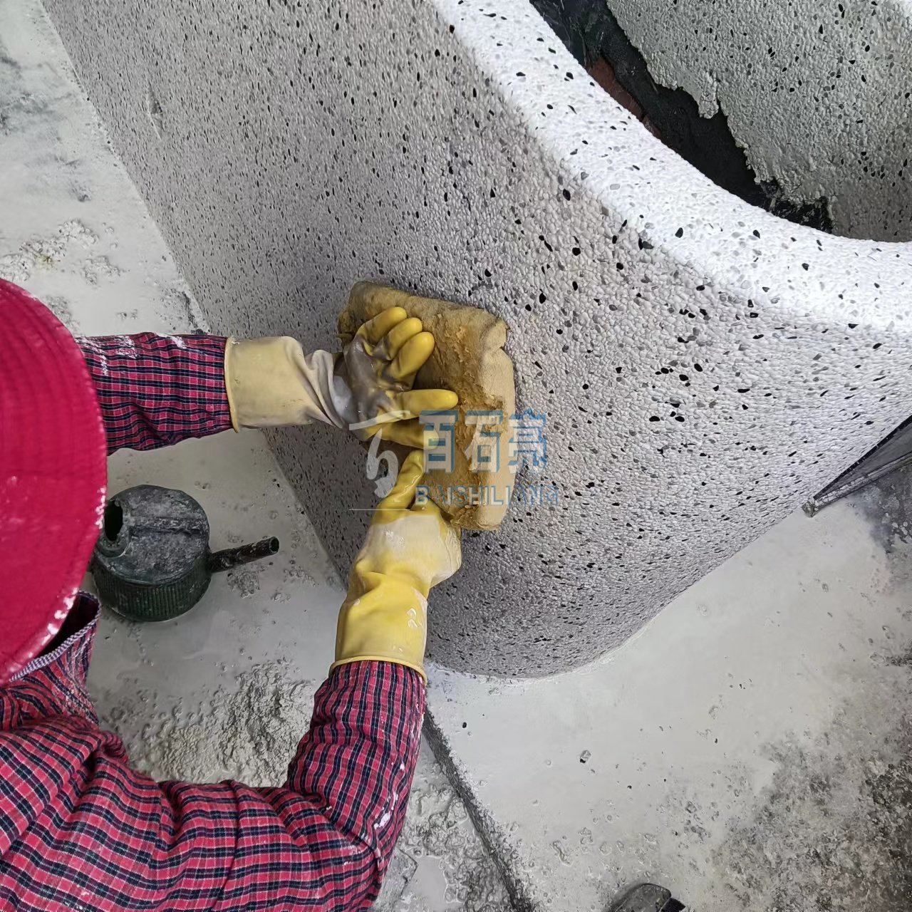 水洗石擦洗中: