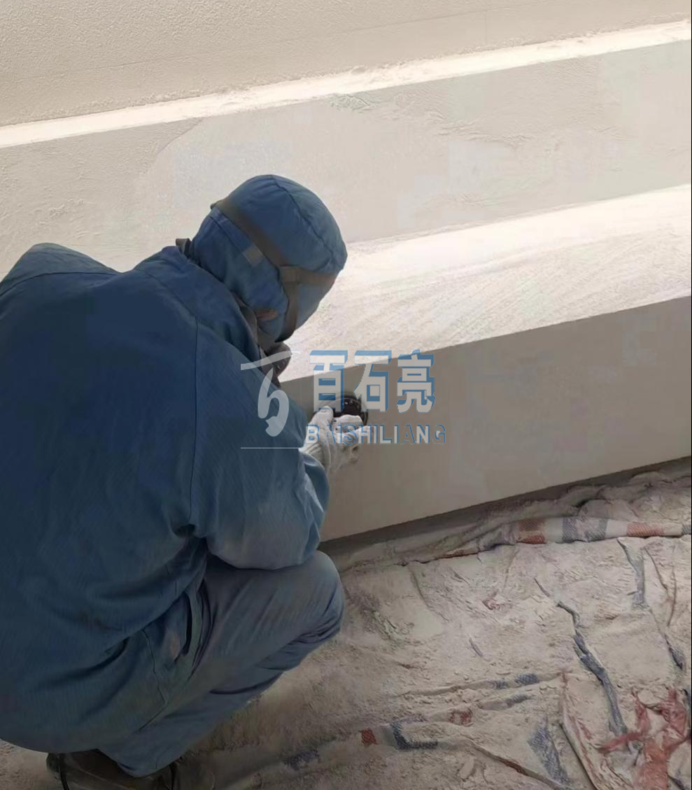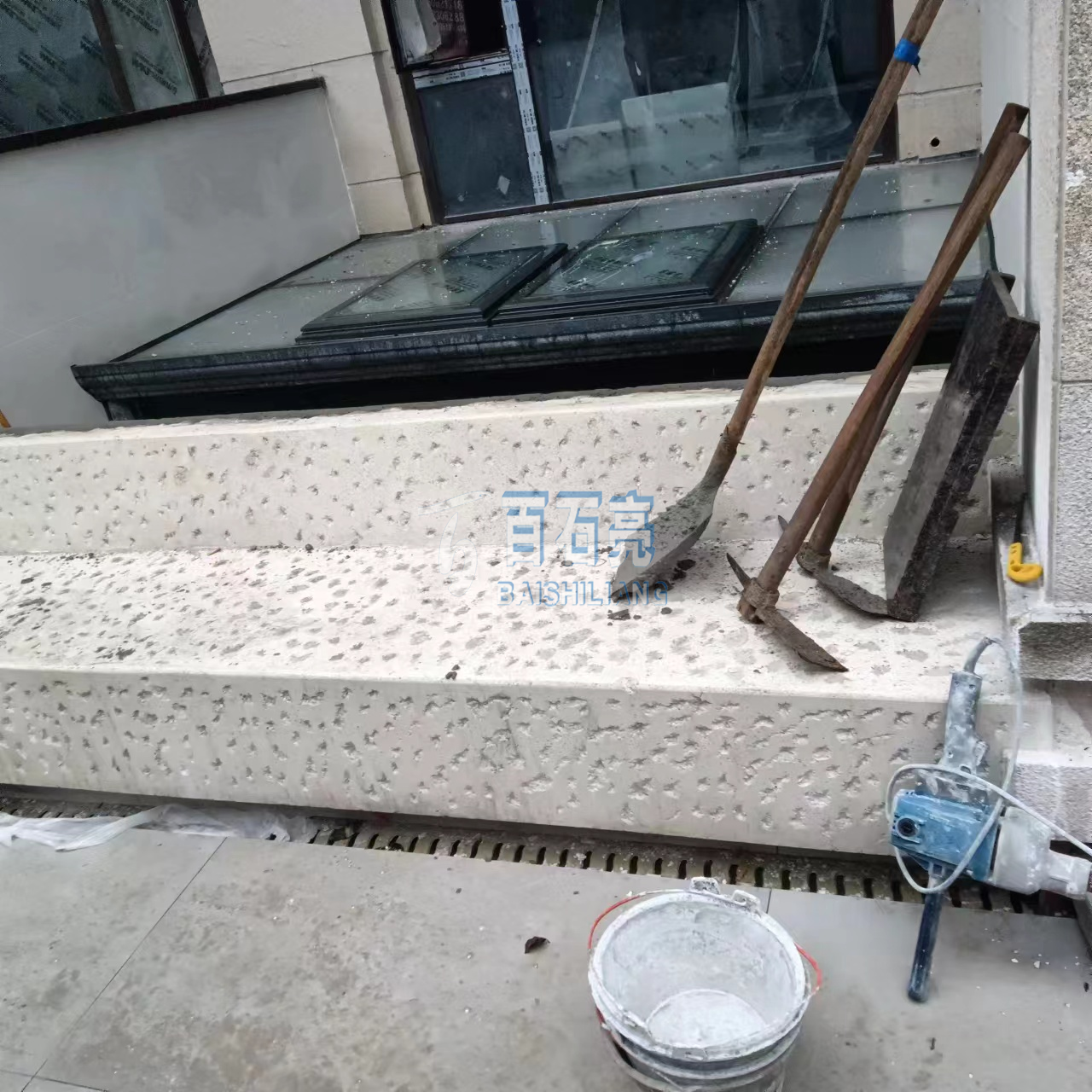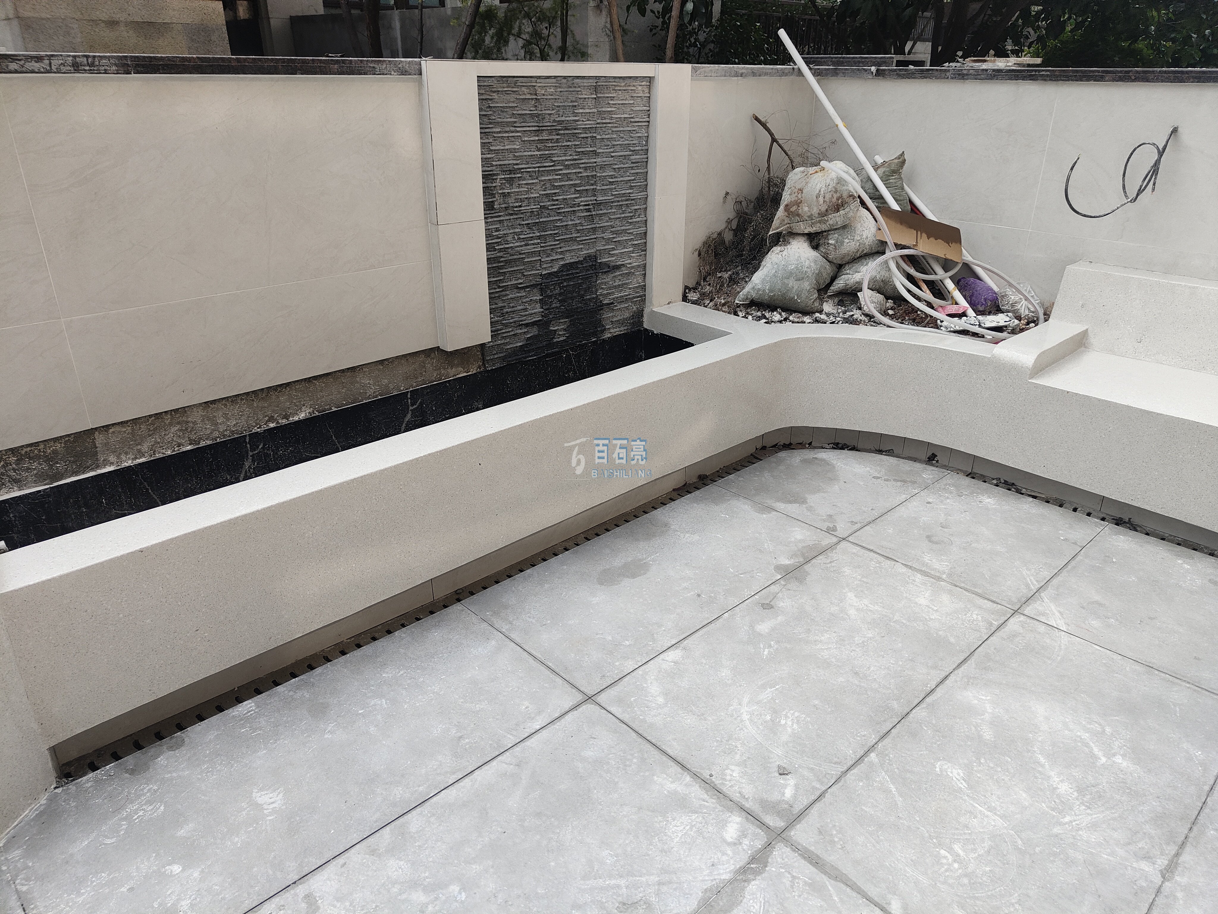 - 渝北壹江郡花園水磨石 這是一款由白色水泥加白色骨料 均勻混合而成的水磨石 用在花園地面 光滑又平整 清新自然 攤鋪 將混合均勻的水磨石材料攤鋪在地面上厚度1.5-2公分。 使用靠尺...