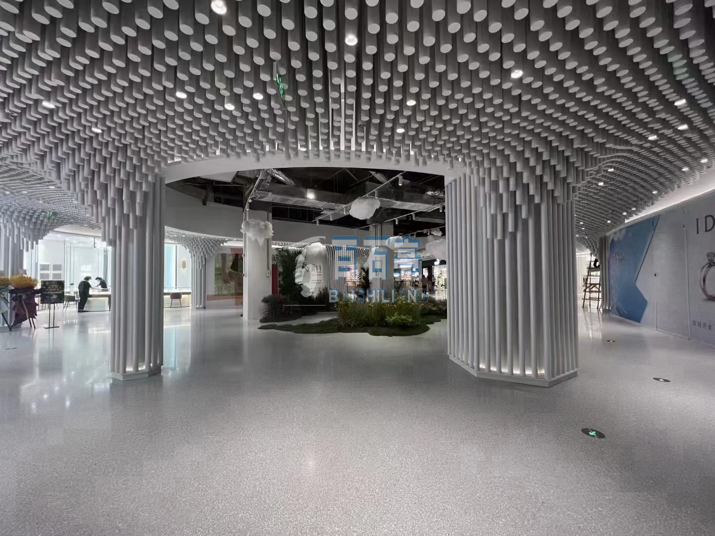 - 渝北壹江郡花園水磨石 這是一款由白色水泥加白色骨料 均勻混合而成的水磨石 用在花園地面 光滑又平整 清新自然 攤鋪 將混合均勻的水磨石材料攤鋪在地面上厚度1.5-2公分。 使用靠尺...