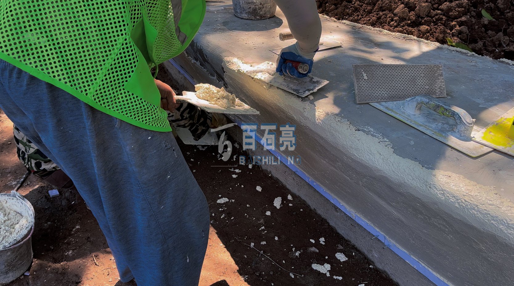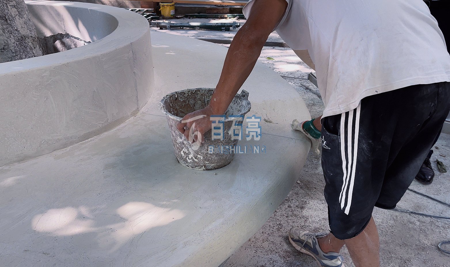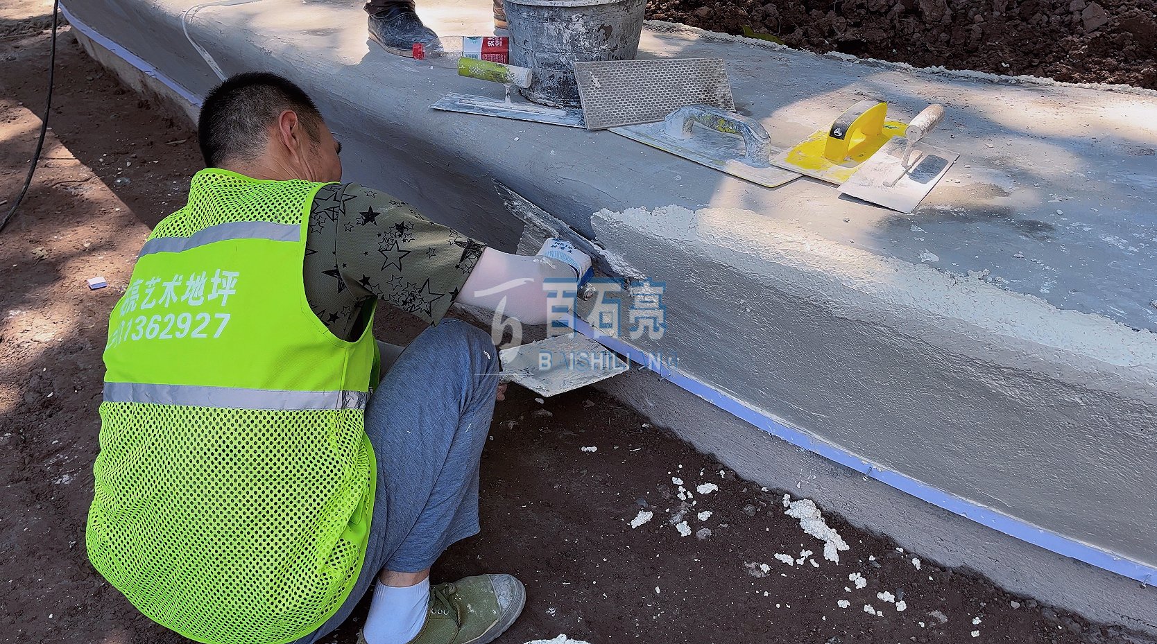 先將基底與骨料混合均勻,加適量的清水,要恰到好處,不能太干,也不能太稀了。然后就可以進(jìn)行攤鋪工作。把混合好的材料,平整的攤鋪在水泥基礎(chǔ)上。因?yàn)檫@個(gè)花池是弧形外伸的形狀,所以還是有一些施工難度的。
