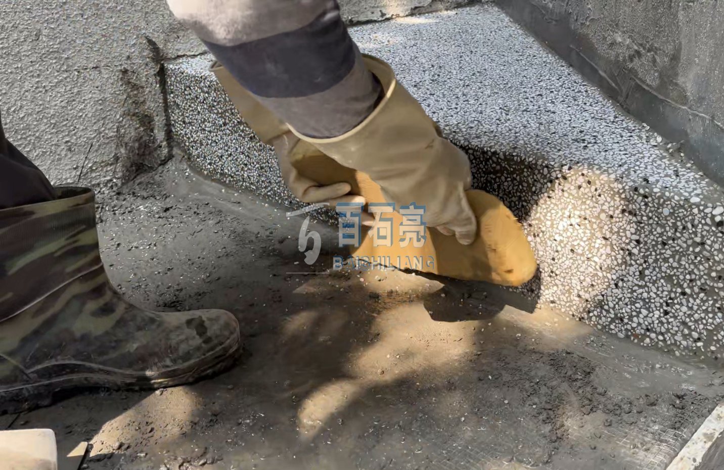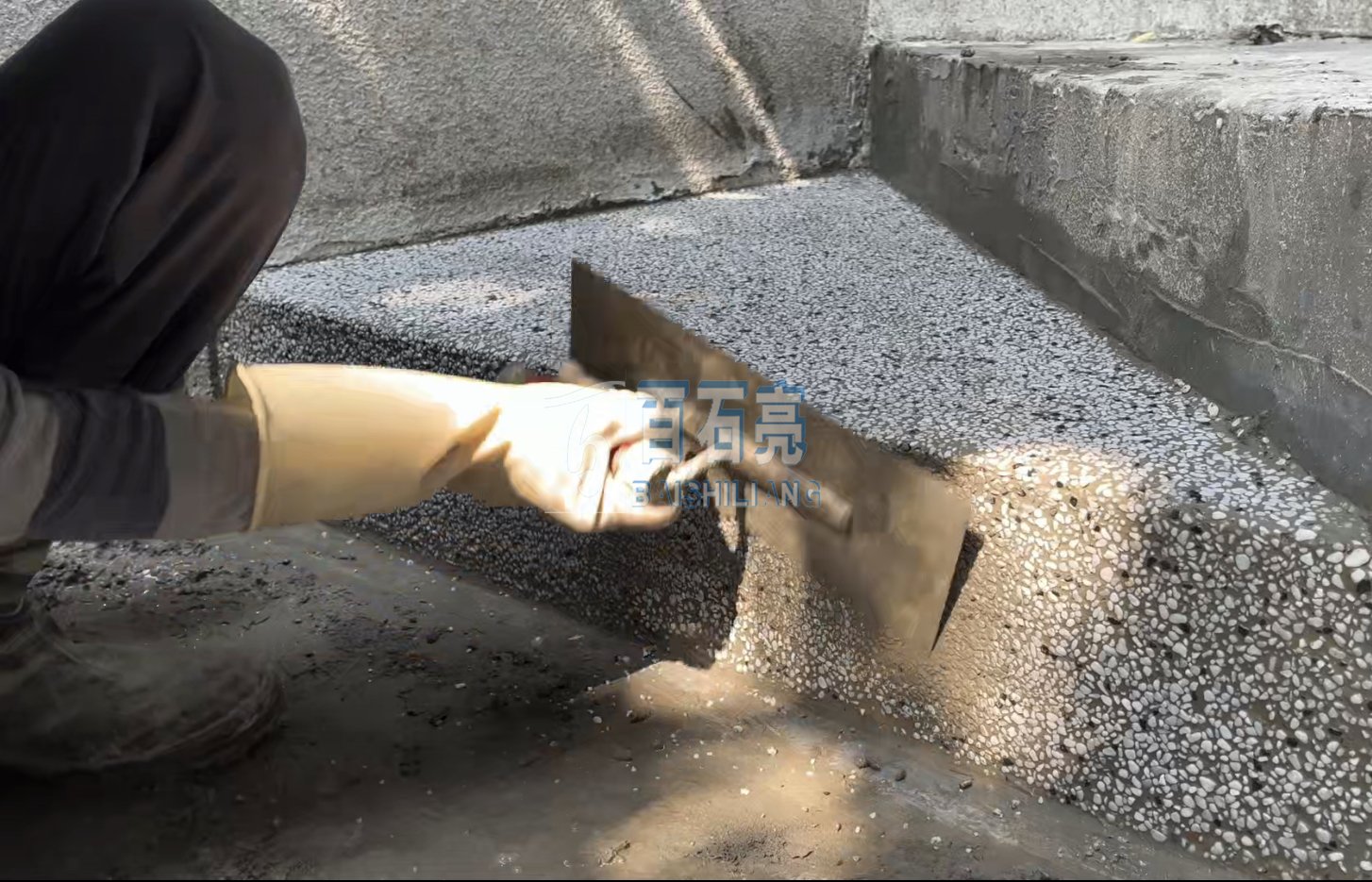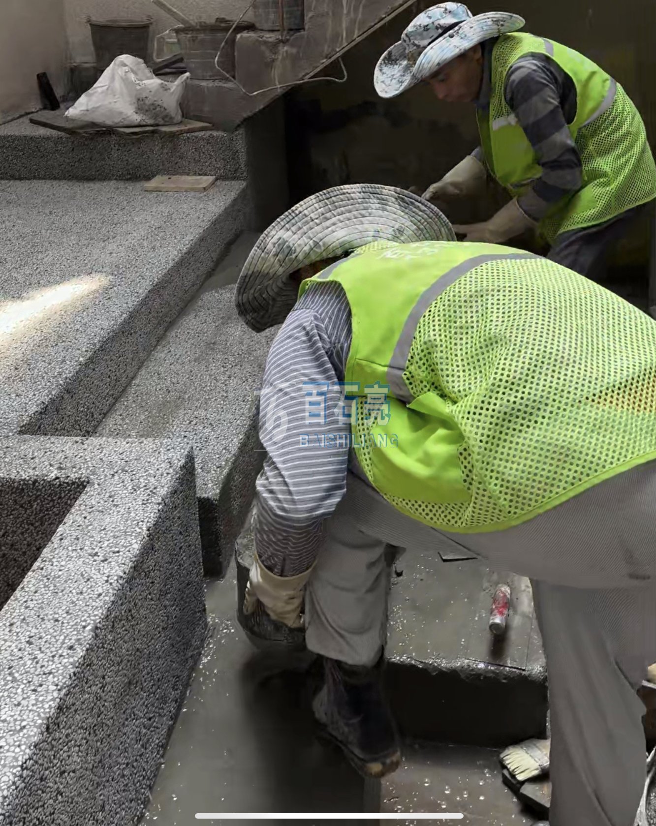 - 渝北壹江郡花園水磨石 這是一款由白色水泥加白色骨料 均勻混合而成的水磨石 用在花園地面 光滑又平整 清新自然 攤鋪 將混合均勻的水磨石材料攤鋪在地面上厚度1.5-2公分。 使用靠尺...