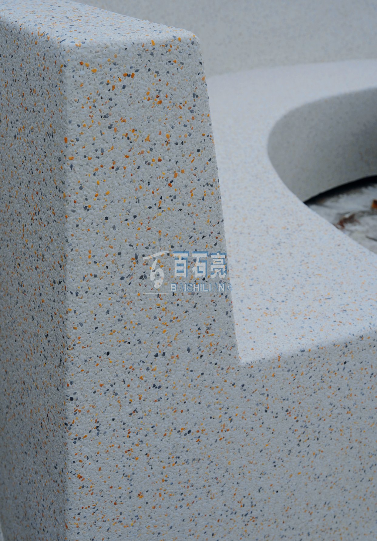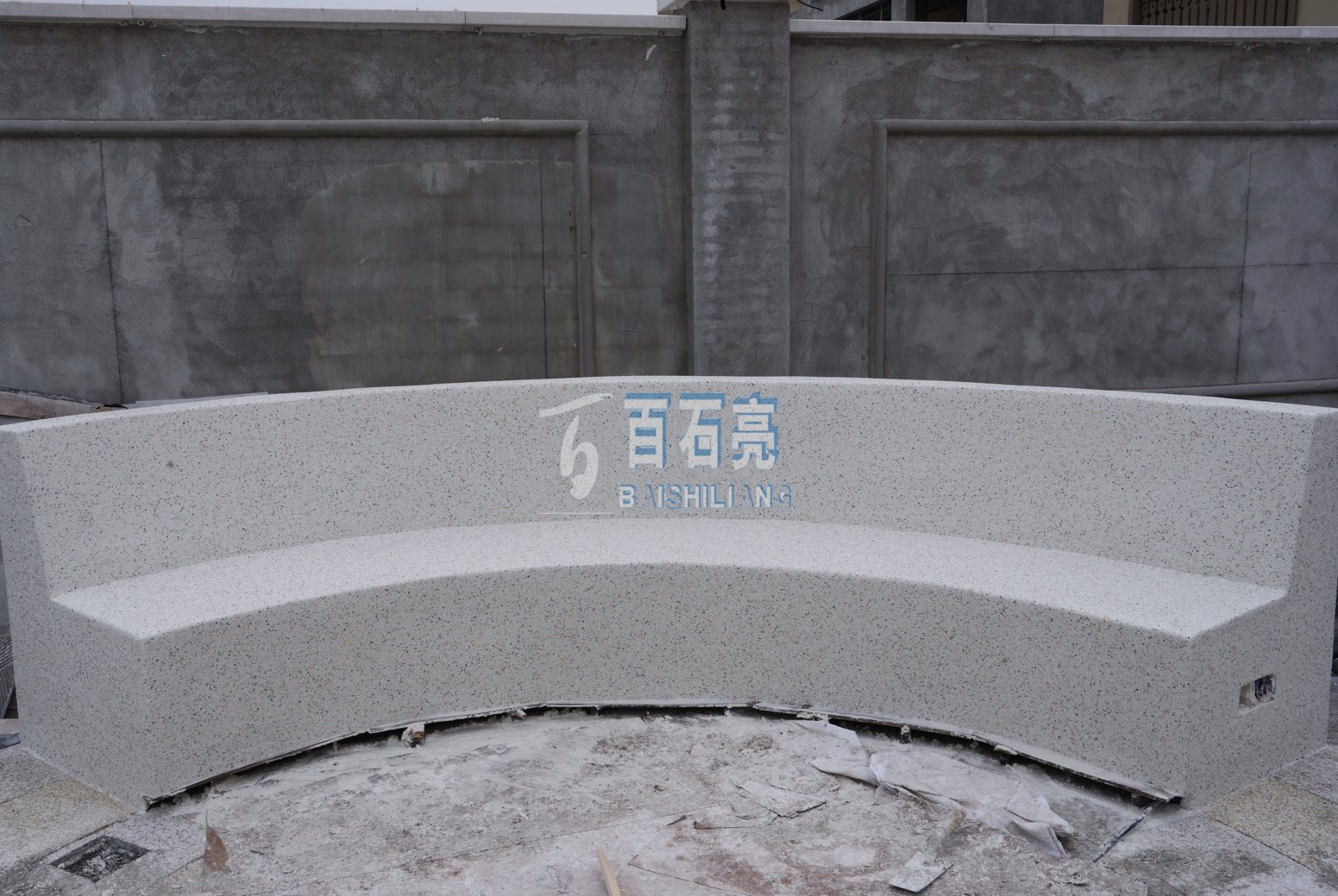 今天為大家分享的是一款弧形水洗石坐凳。這款弧形水洗石坐凳是客戶特別喜歡的設計風格。先用混泥土澆筑成型,然后在表面涂上粘接劑,這樣才能讓水洗石更好的鋪貼在坐凳上,不會掉落。
