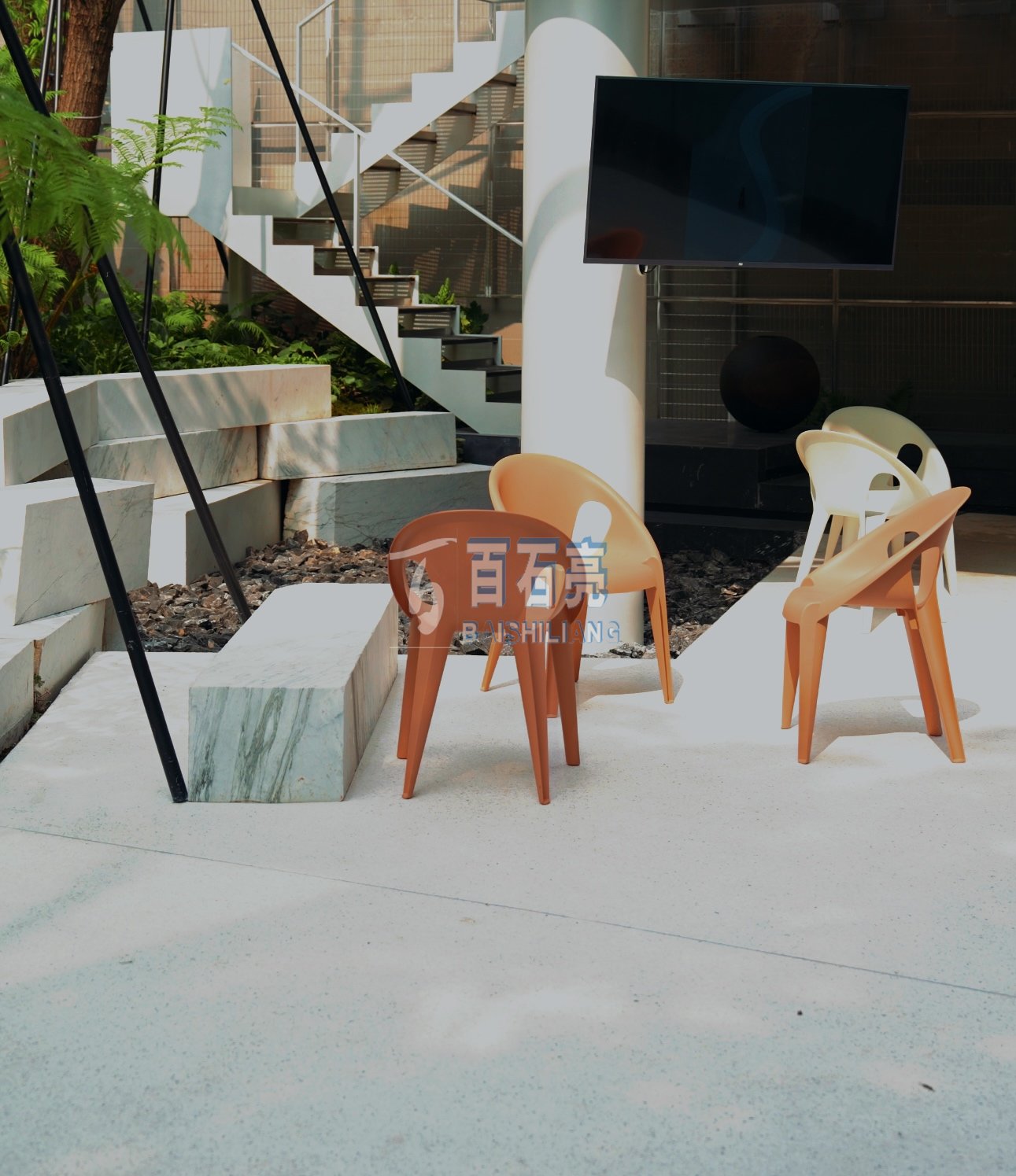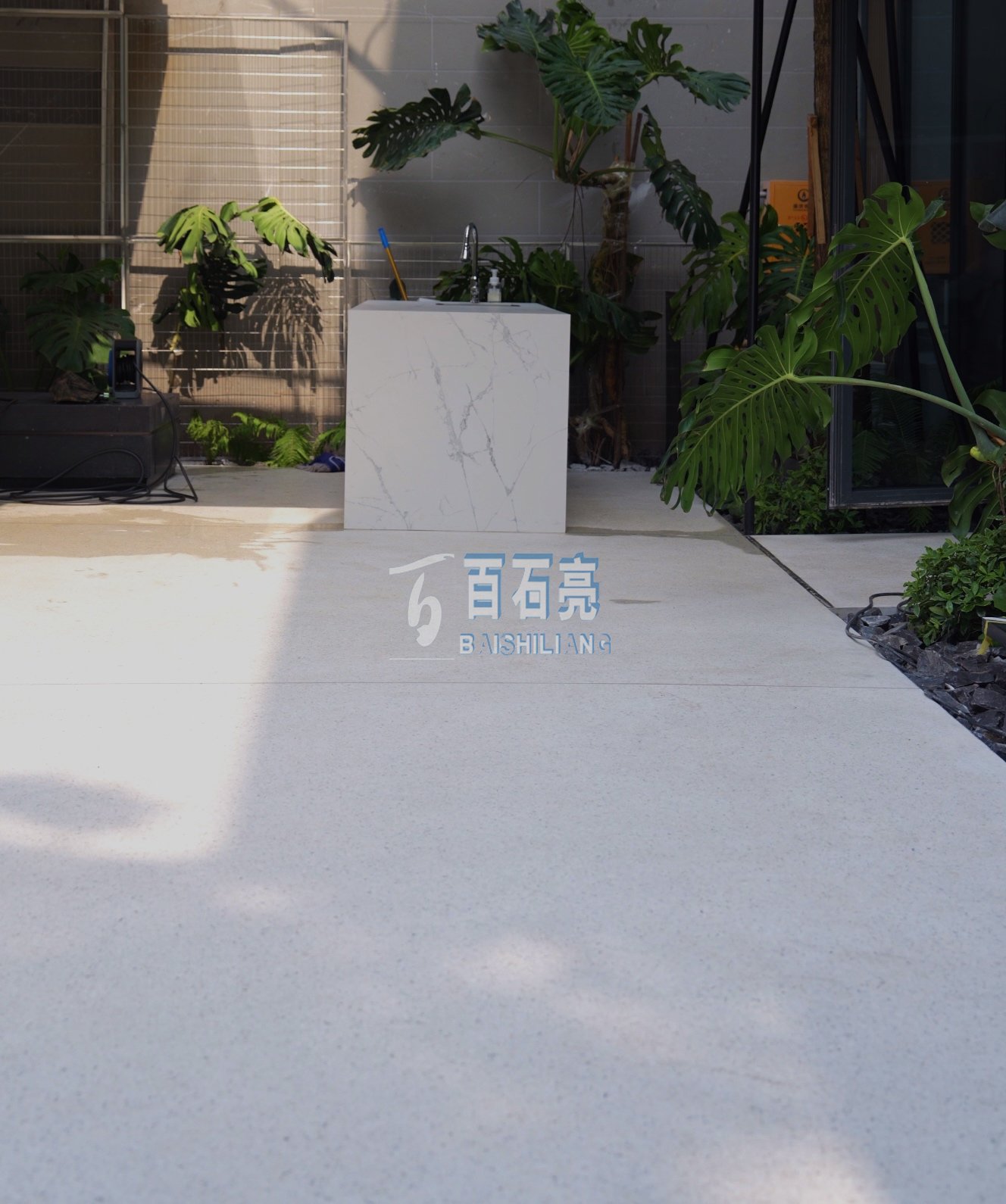 完工后的水磨石效果:整體無縫,平整光滑,與綠植景觀搭配顯得特別簡約高級。