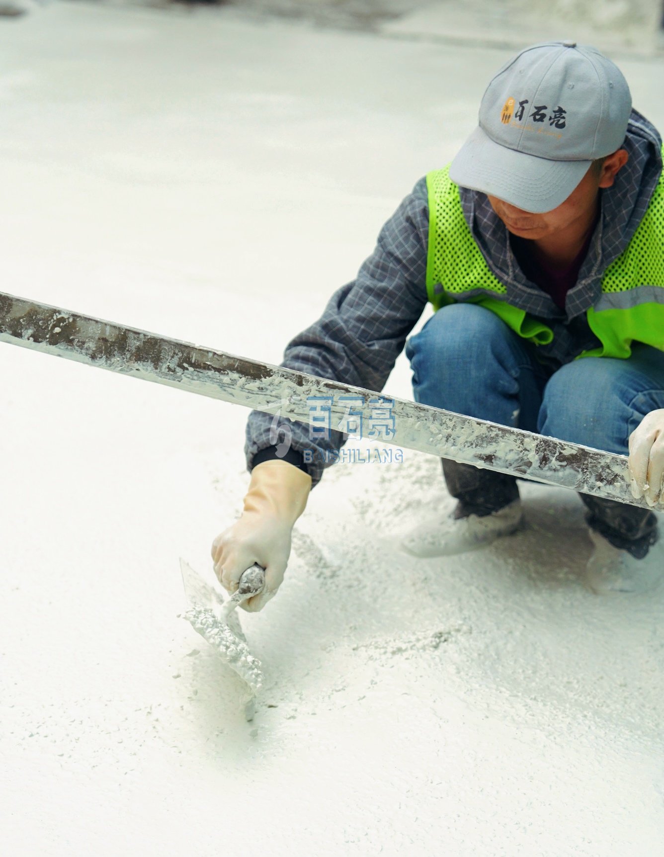 使用靠尺將地的水磨石材料攤鋪平整,保持厚度一致。