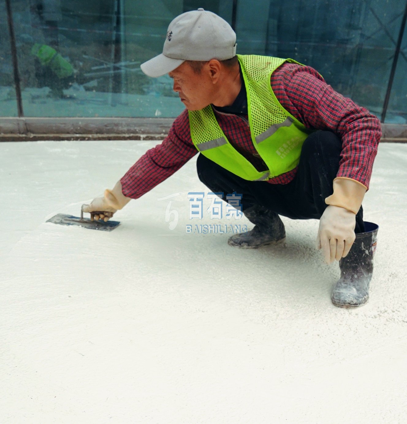 將混合均勻的水磨石材料攤鋪在地面上厚度1.5-2公分。