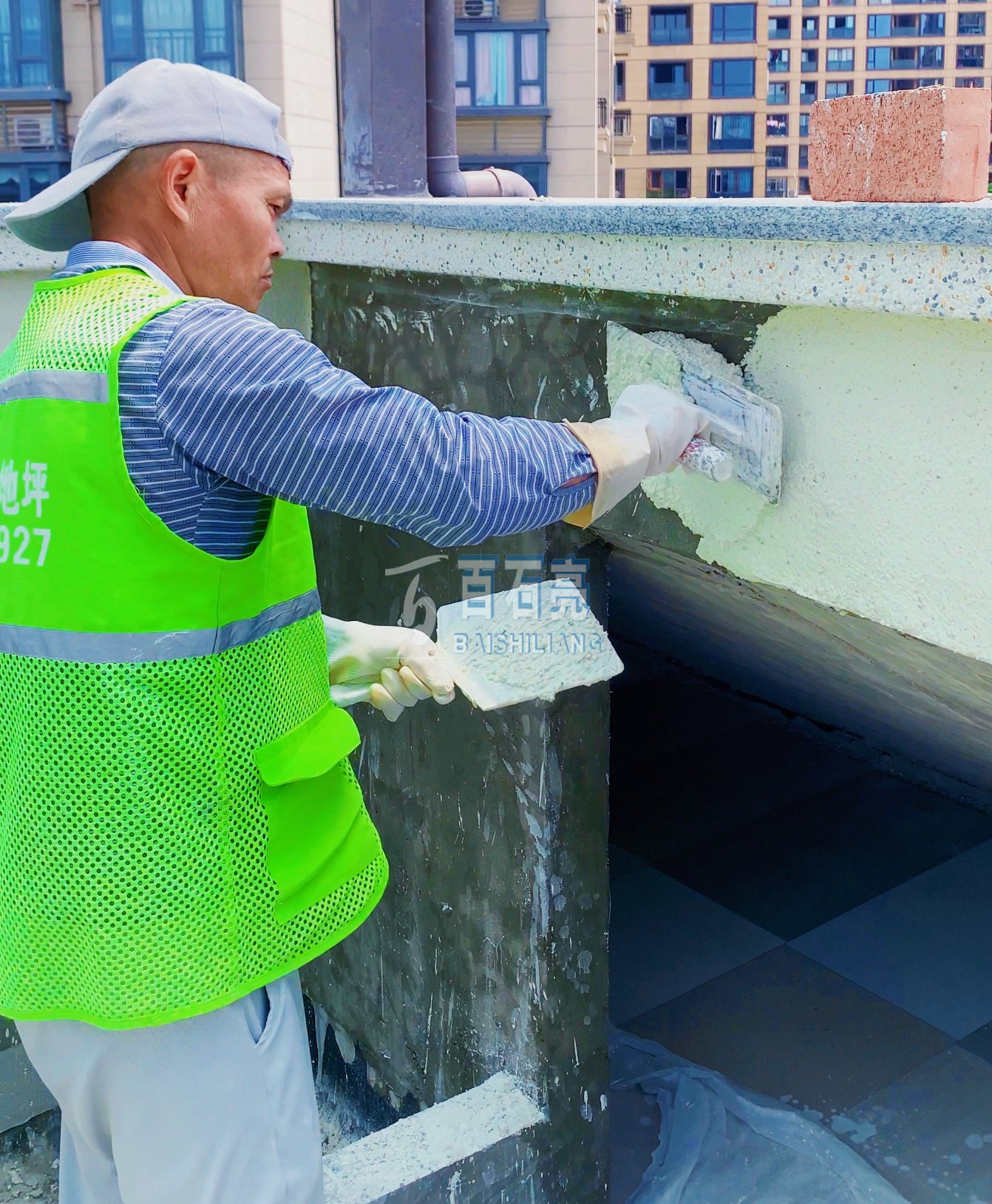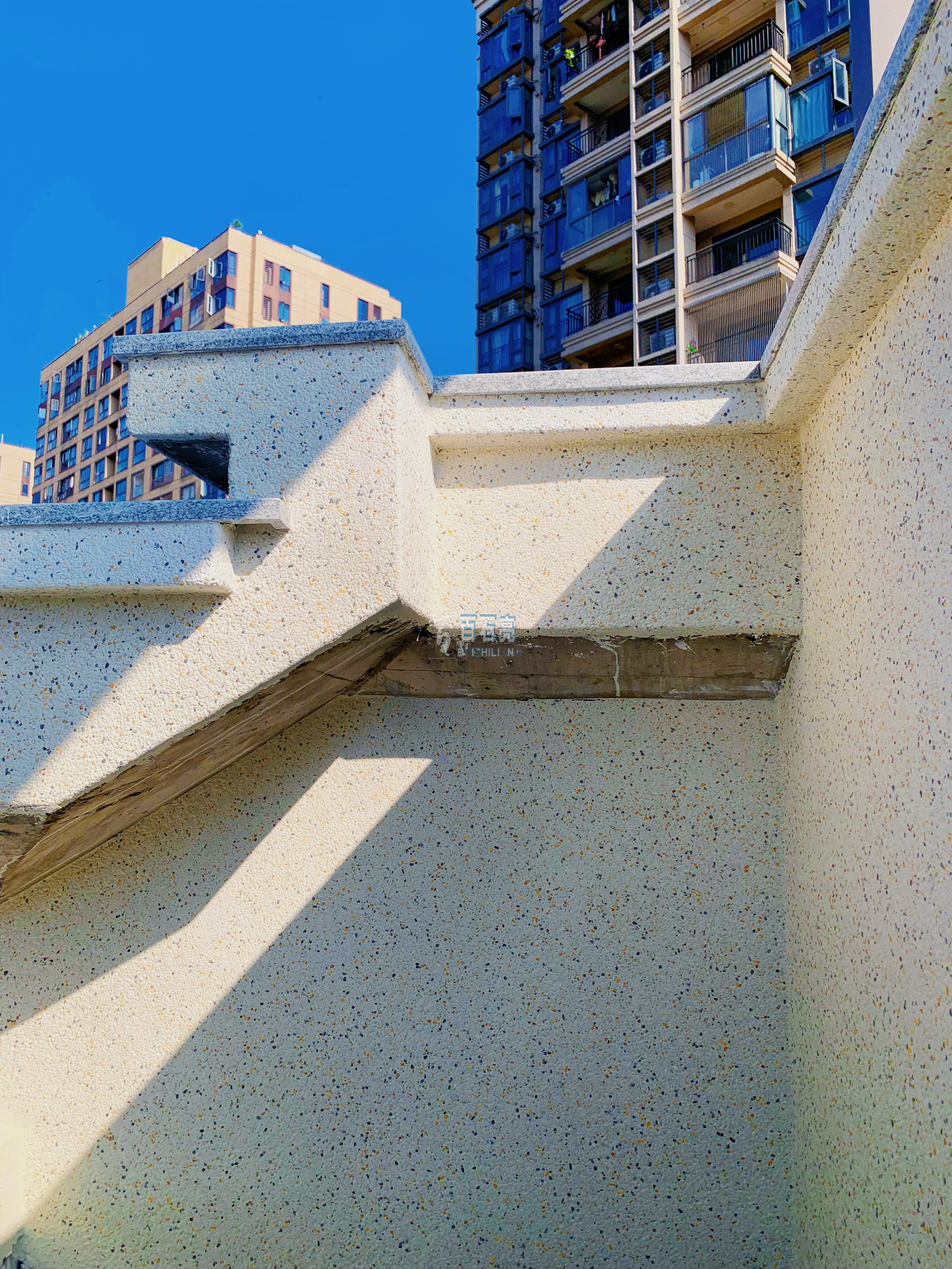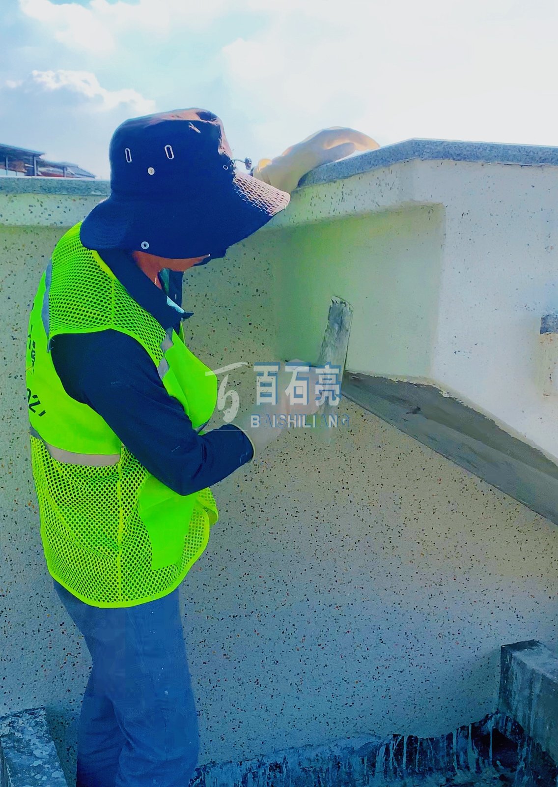 將攪拌好的水洗石材料攤鋪在屋頂花園的墻面、花池、坐凳上面。