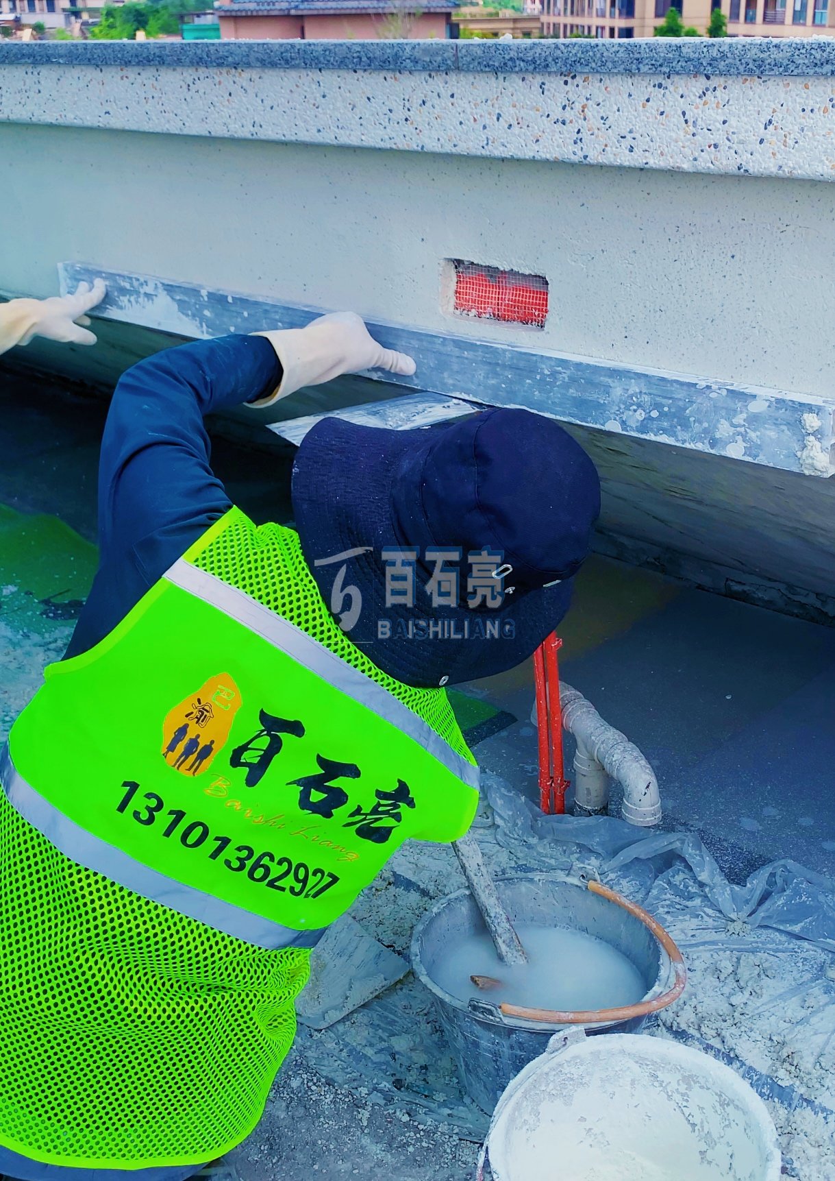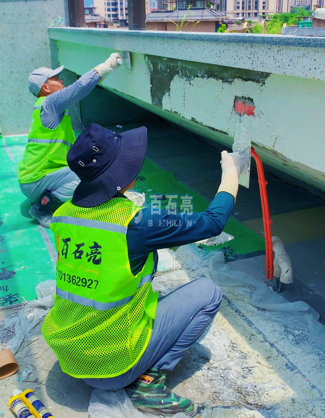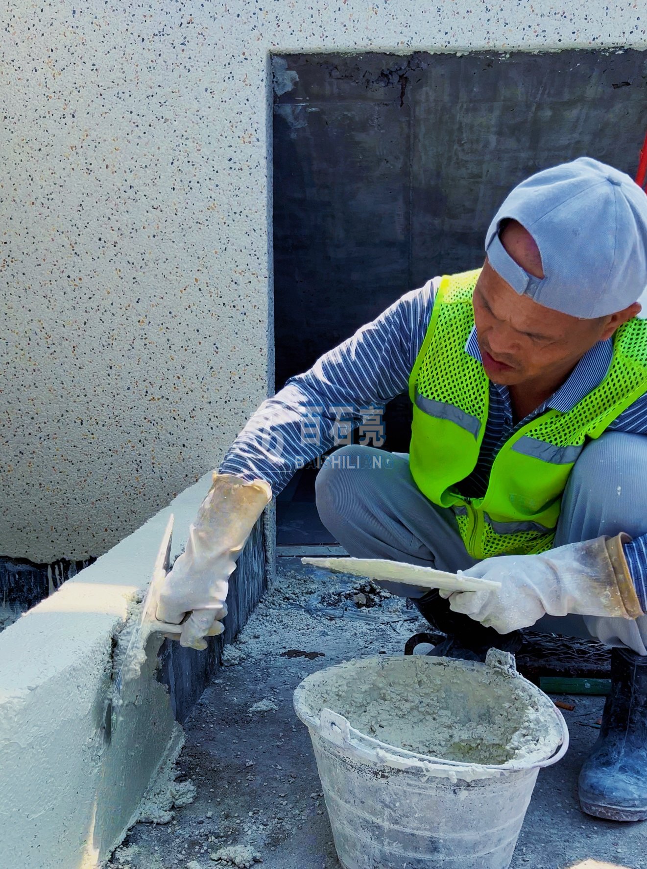 將攪拌好的水洗石材料攤鋪在屋頂花園的墻面、花池、坐凳上面。