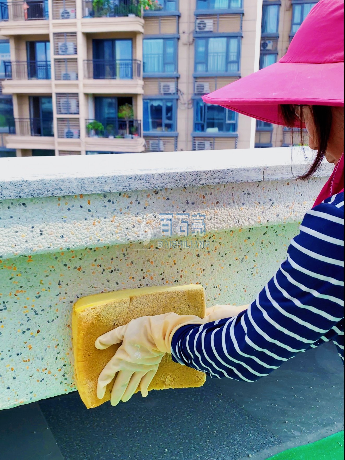 水洗石最重要的步驟就是刷洗了,用柔軟的海綿輕輕的刷洗,直到將表面的水泥漿完全刷洗干凈,沒(méi)有殘留的水泥漿,表面露出2/3的水洗石骨料。