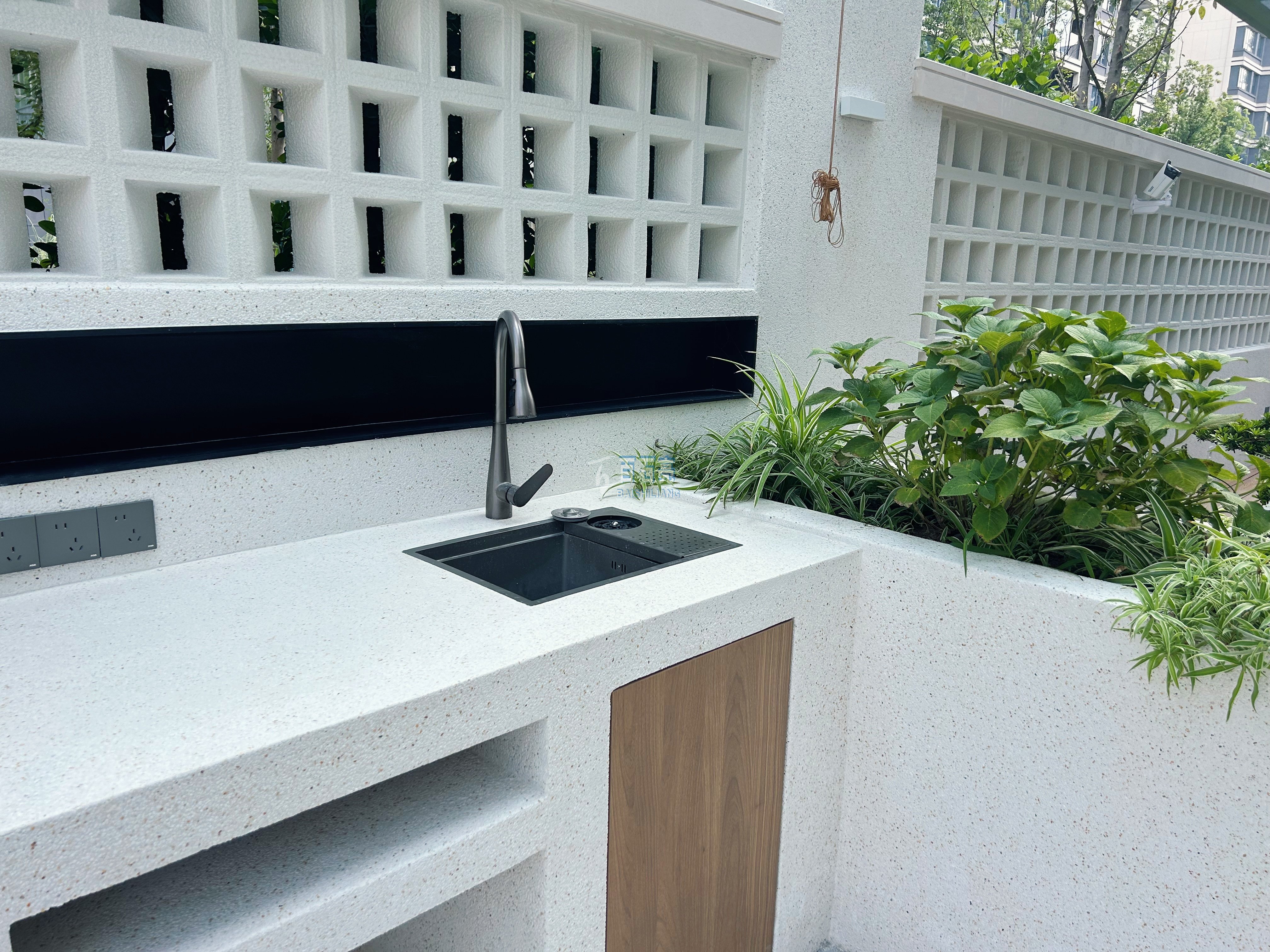 水洗石可塑性超強(qiáng),將墻面與操作臺整體連接在一起,使整個花園達(dá)到簡約自然,大氣舒適的效果。
