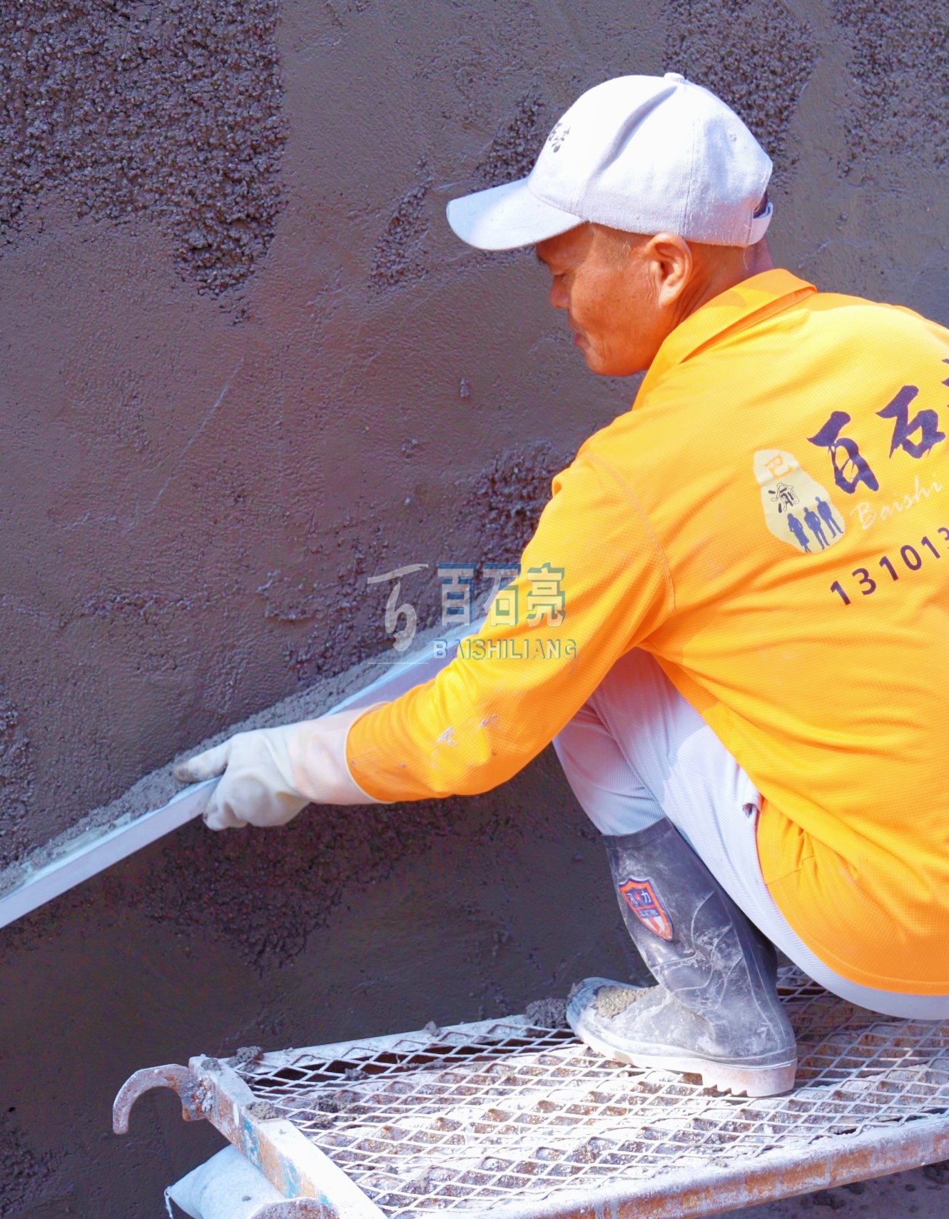 將攪拌均勻的水洗石材料攤鋪在墻面基礎(chǔ)上,用鐵板稍微攤鋪開,然后使用鋁合金靠尺進(jìn)行找平,讓水洗石在同一平面上