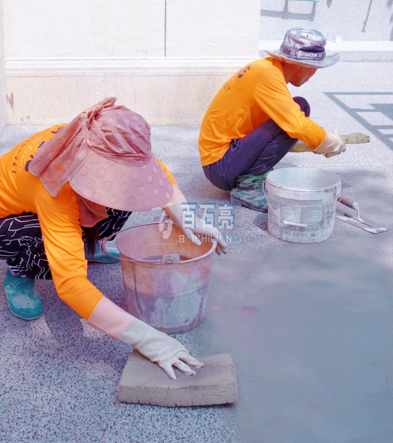 攤鋪好之后的水洗石,用鐵板來回的收平壓密實(shí),這樣可以讓水洗石更加的平整,顆粒更加密實(shí)飽滿。