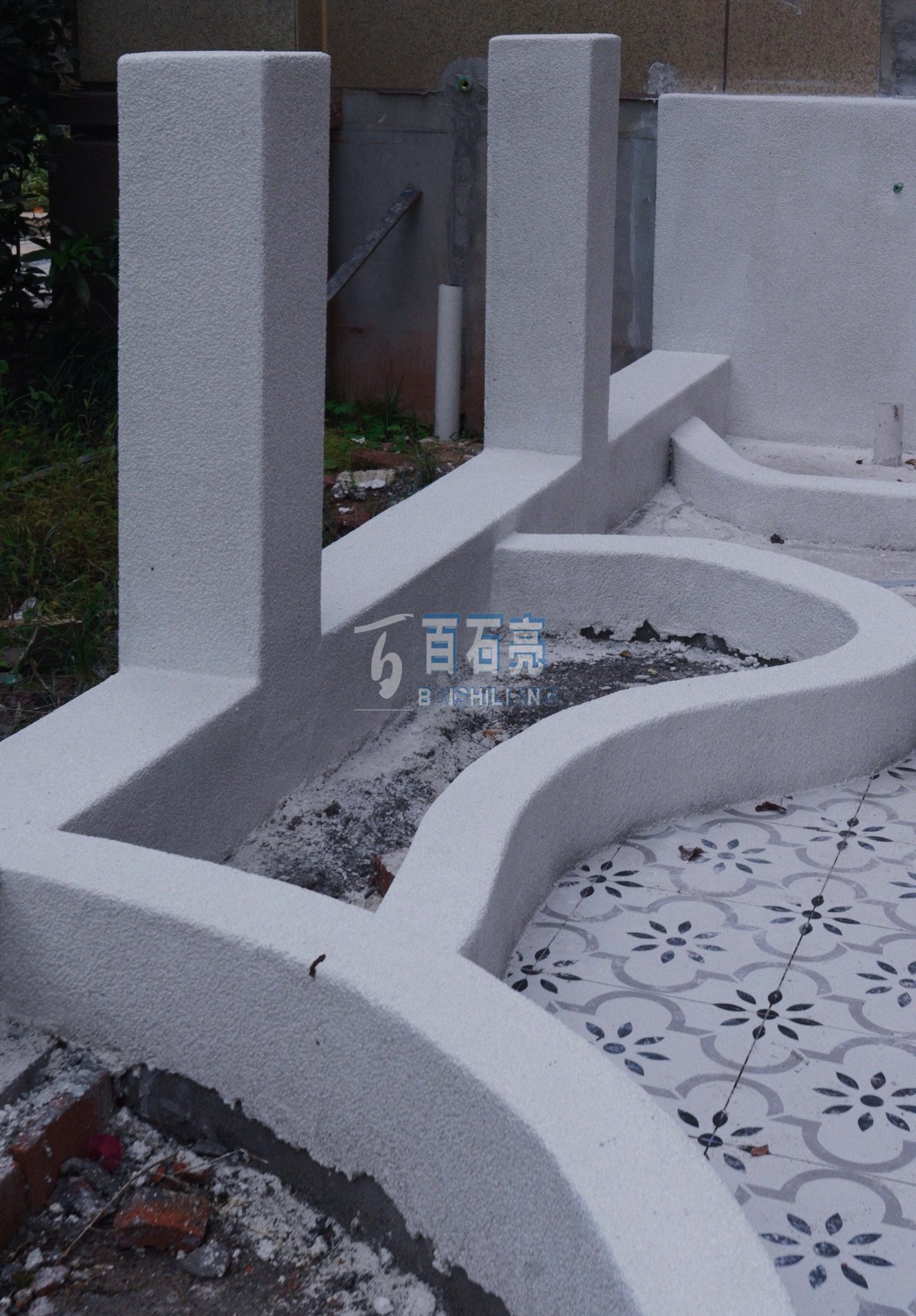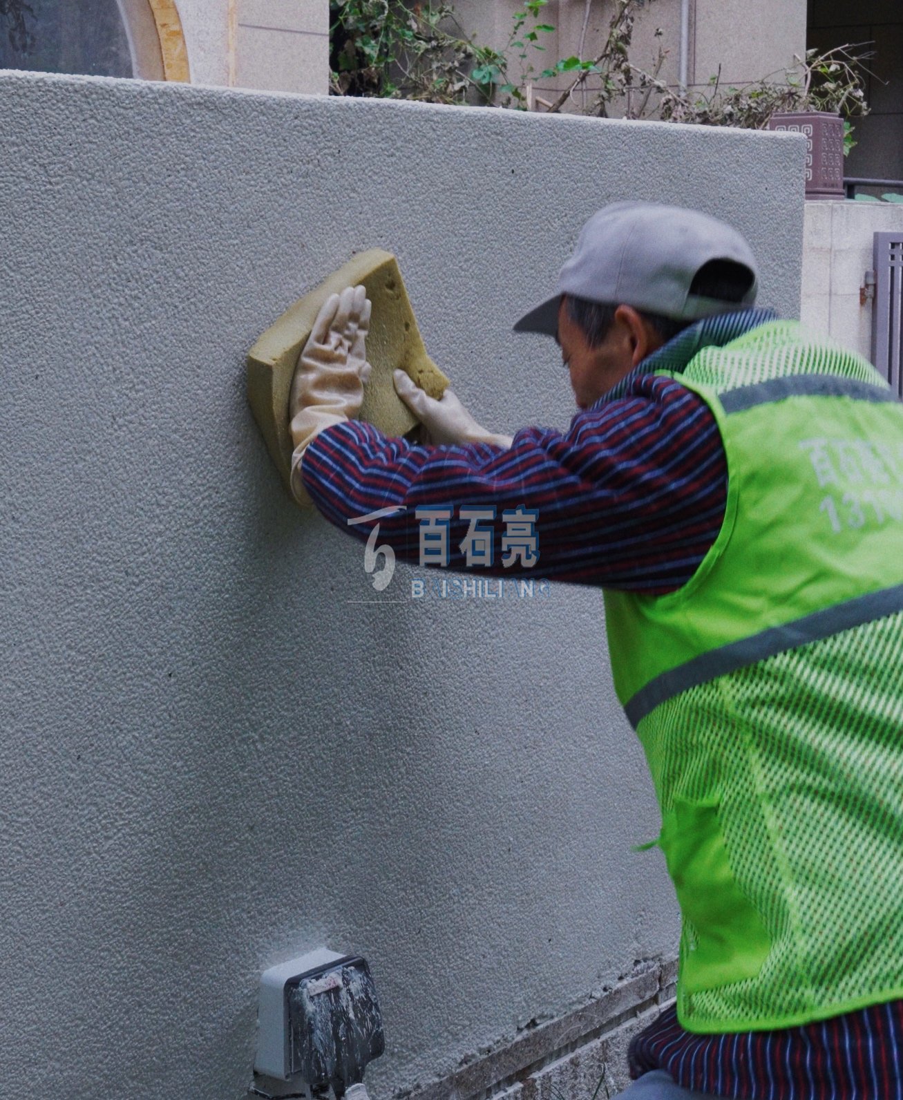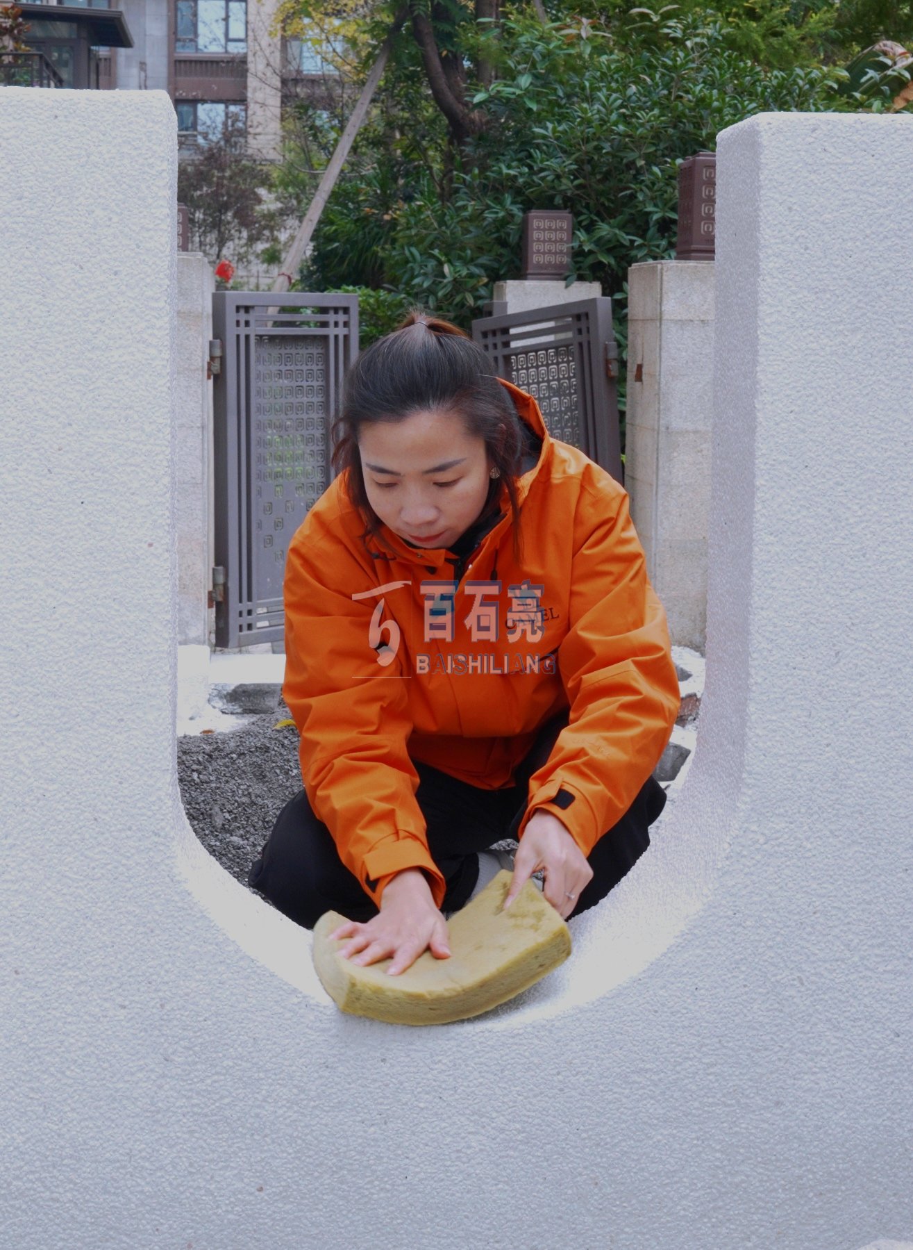 將攪拌好的材料攤鋪在平面或者是立面上。攤鋪要盡量保證水洗石平整度一致,攤鋪立面的難度比平面的大很多,對師傅的技術(shù)有很大考驗的。