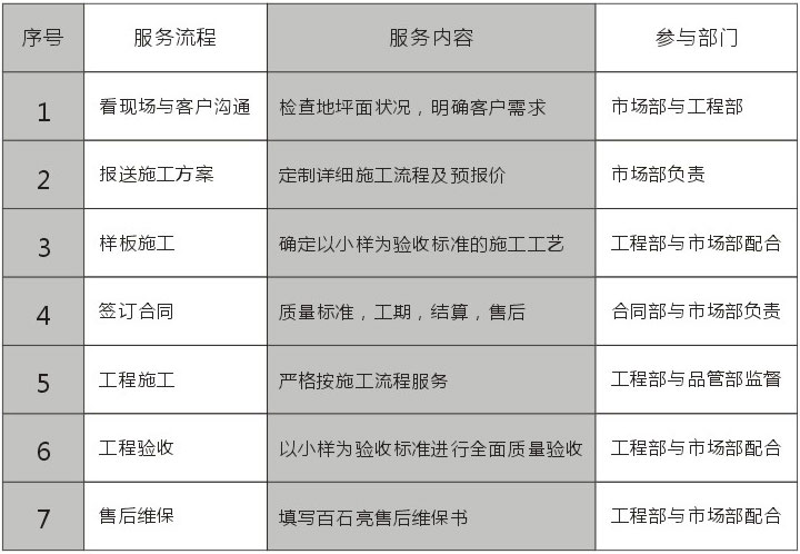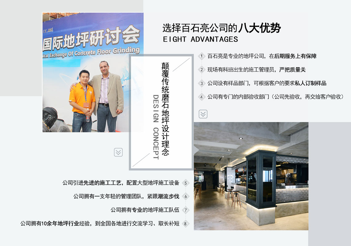 重慶百石特晶亮環(huán)??萍加邢薰臼且患覍I(yè)從事各類地坪工程設(shè)計(jì)、施工,具有地坪資質(zhì)的專業(yè)地坪公司。主要從事高檔藝術(shù)水磨石地坪施工、水磨石地坪施工、水磨石生產(chǎn)、成品水磨石銷售。公司倡導(dǎo)“勤奮、創(chuàng)新、科學(xué)、熱情、質(zhì)優(yōu)、價(jià)廉”的職業(yè)精神?,F(xiàn)已逐漸發(fā)展成為:成都蜀漢園林重慶分公司、順風(fēng)123、渝興小學(xué)、巴蜀中學(xué)、巴蜀小學(xué)、重慶鳴洋警安、重慶京東方科技集團(tuán)、重慶龍湖地產(chǎn)、重慶啟程醫(yī)藥等眾多重慶著名企業(yè)的長期、緊密的合作伙伴。